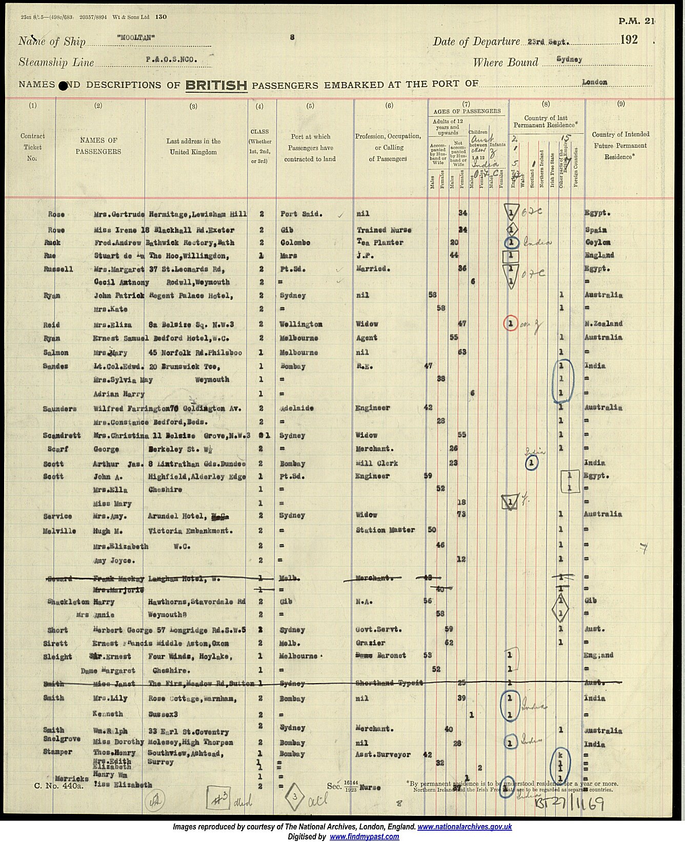 Passenger list London to Sydney 23 September 1927