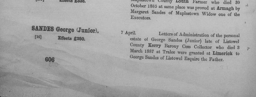 "Ireland Calendar of Wills and Administrations, 1858-1920," database with images, FamilySearch (https://familysearch.org/ark:/61903/1:1:K6MF-25N : 13 March 2018), George Sandes in entry for George Sandes, 03 Mar 1887; citing 00690, 005014901, Principal Probate Registry, Dublin; 100,987.