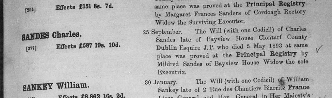 Reference: Irish wills 1858 -1920 - Charles Sandes