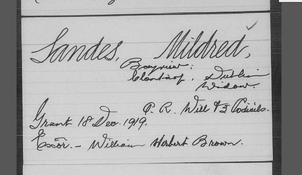 "Ireland Calendar of Wills and Administrations, 1858-1920," database with images, FamilySearch (https://familysearch.org/ark:/61903/1:1:K62N-CNH : 13 March 2018), William Herbert Brown in entry for Mildred Sandes, 18 Dec 1919; citing 01289, 005014923, Principal Probate Registry, Dublin; 101,009.