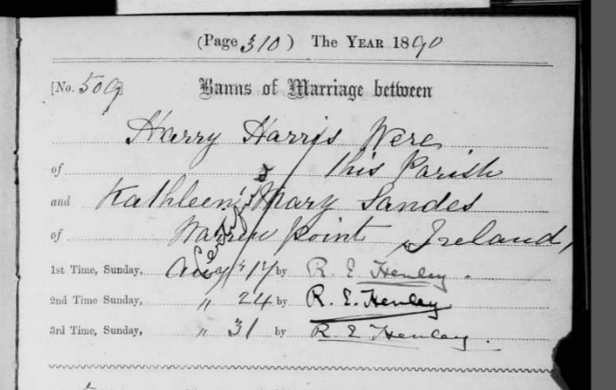 "England, Cheshire Parish Registers, 1538-2000," database, FamilySearch (https://familysearch.org/ark:/61903/1:1:F762-43X : 7 December 2017), Harry Harris Were and Kathleen Mary Sandes, , Intended Marriage; citing Page: 310 Record number: 509, , Record Office, Chester; FHL microfilm 2,068,306.