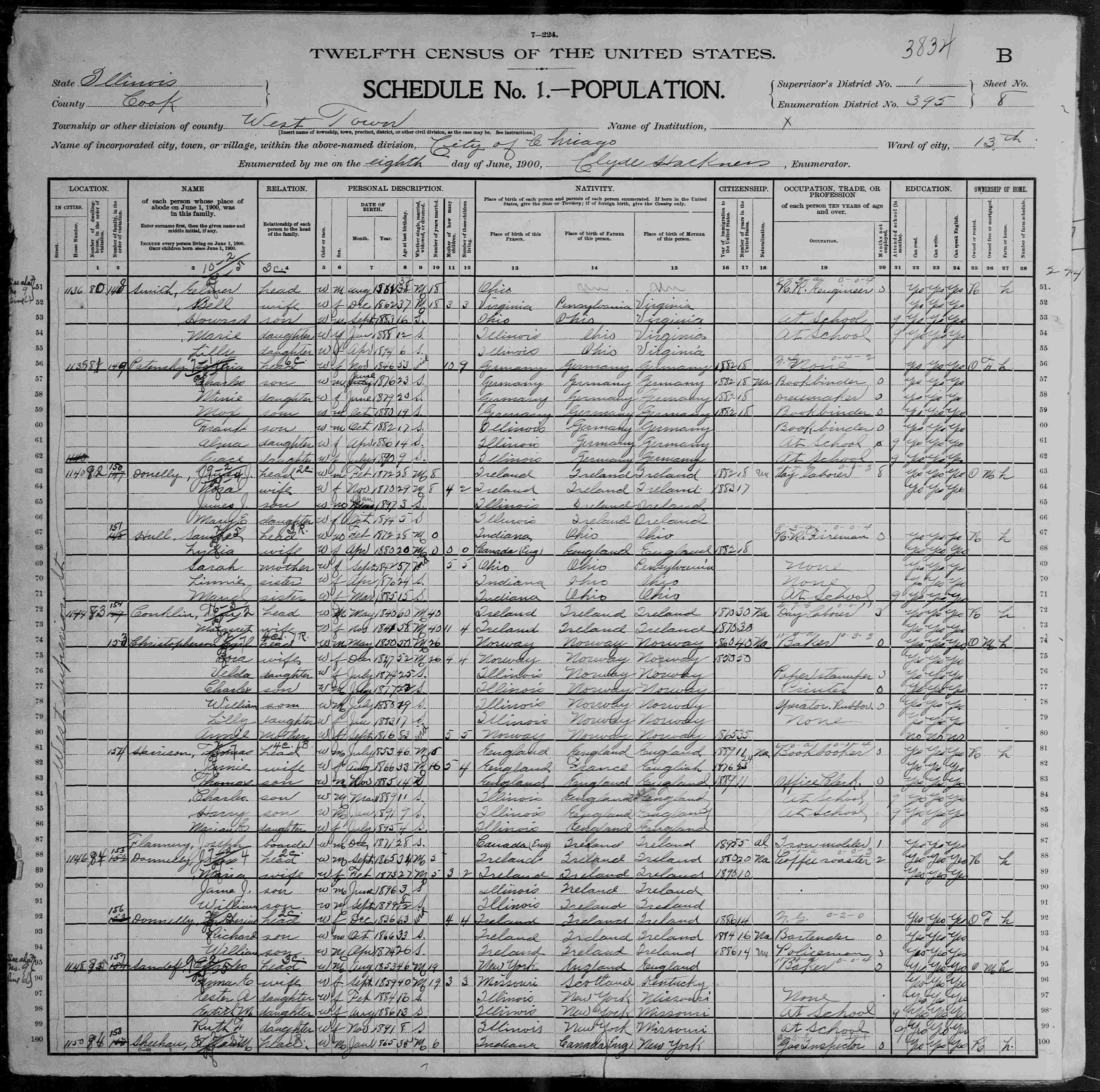 "United States Census, 1900," database with images, FamilySearch (https://familysearch.org/ark:/61903/1:1:MS3N-7SF : accessed 21 September 2020), Charles Sando?, Precinct 14 Chicago city Ward 13, Cook, Illinois, United States; citing enumeration district (ED) 395, sheet 8B, family 157, NARA microfilm publication T623 (Washington, D.C.: National Archives and Records Administration, 1972.); FHL microfilm 1,240,261.