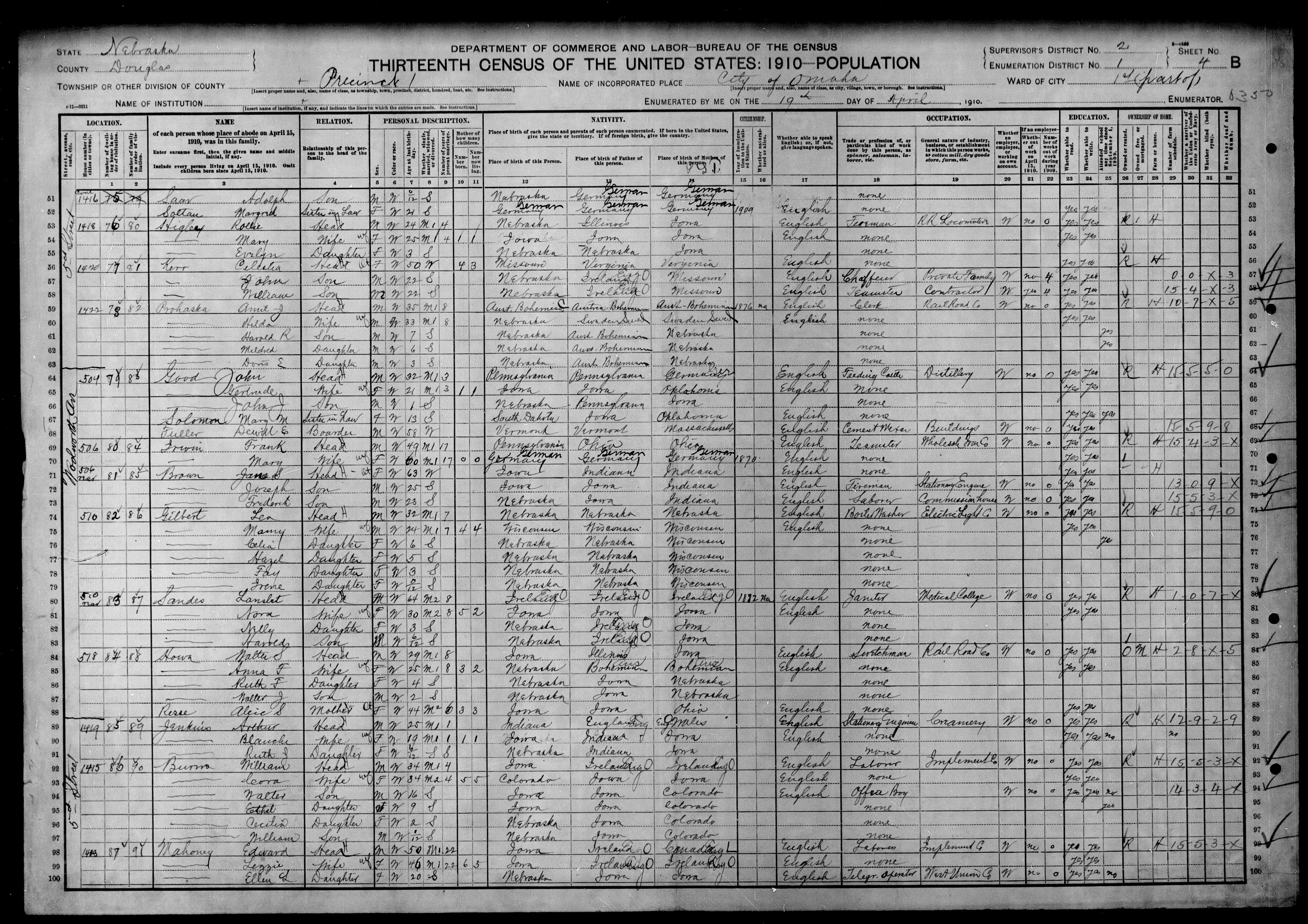 "United States Census, 1910," database with images, FamilySearch (https://familysearch.org/ark:/61903/1:1:ML43-5NR : accessed 15 September 2020), Lanslet Sandes, Omaha Ward 1, Douglas, Nebraska, United States; citing enumeration district (ED) ED 1, sheet 4B, family 87, NARA microfilm publication T624 (Washington D.C.: National Archives and Records Administration, 1982), roll 843; FHL microfilm 1,374,856.