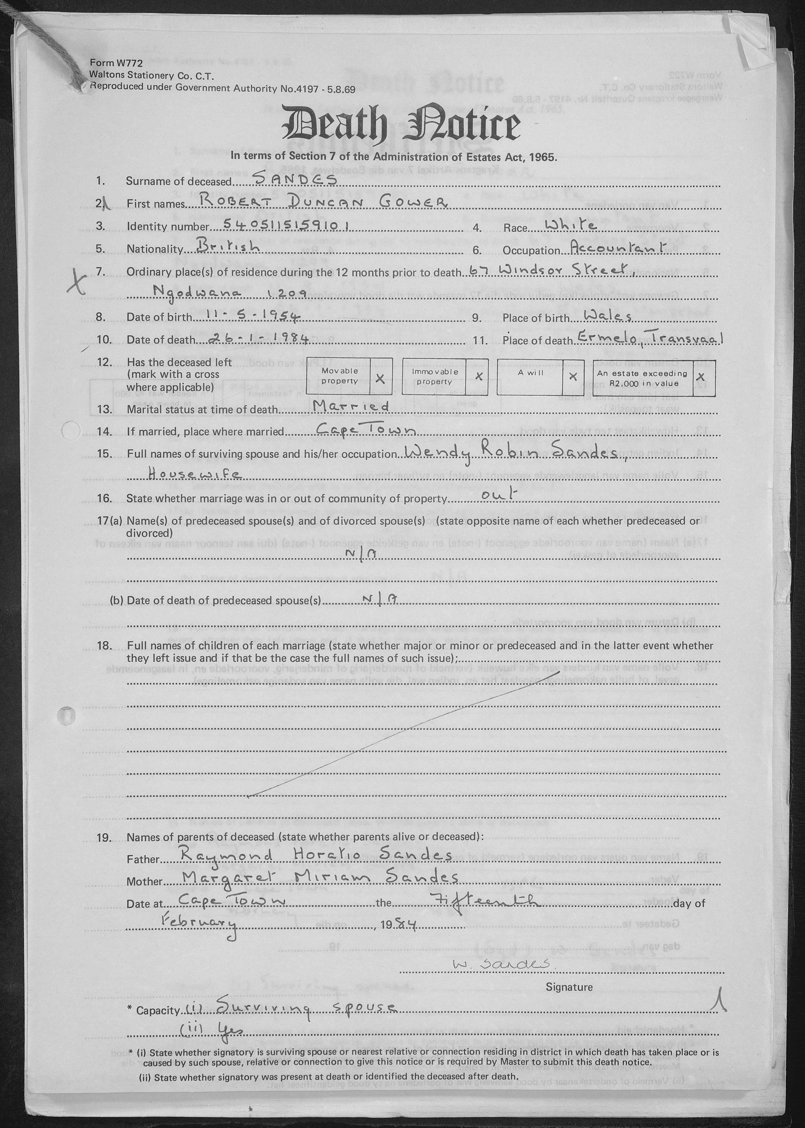 "South Africa, Western Cape, Deceased Estate Files, 1951-1958", database, FamilySearch (https://www.familysearch.org/ark:/61903/1:1:6DZK-JKG9 : 7 January 2022), Robert Duncan Gower Sandes, 1984.