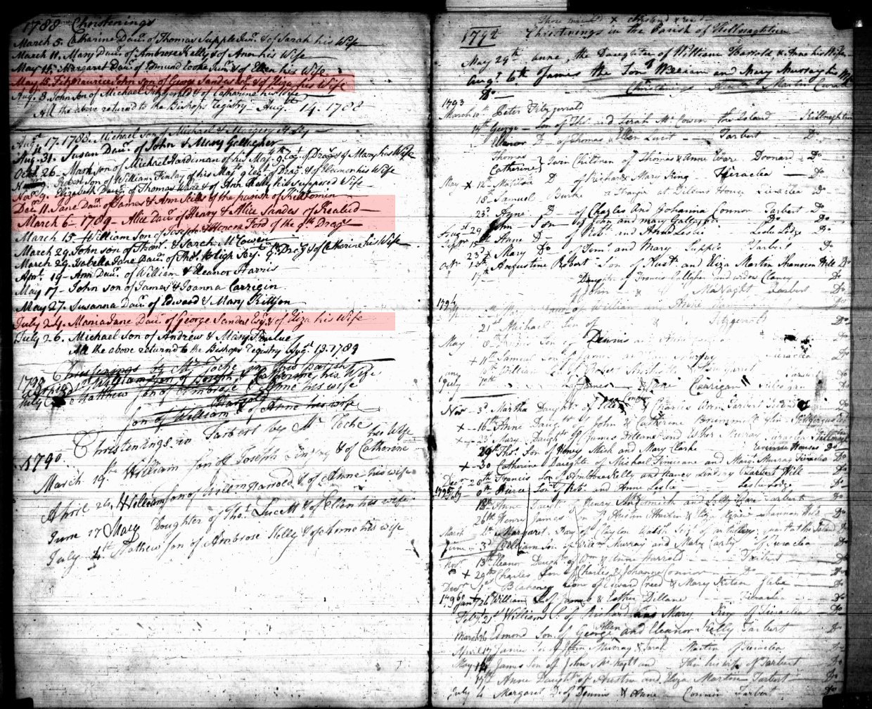 Area - KERRY (COI) , Parish/Church/Congregation - KILNAUGHTIN Baptism of ALICE SANDES of N/R on 6 March 1789 Name ALICE SANDES Date of Birth N/R N/R N/R Address N/R Father HENRY SANDES Mother ALICE SANDES