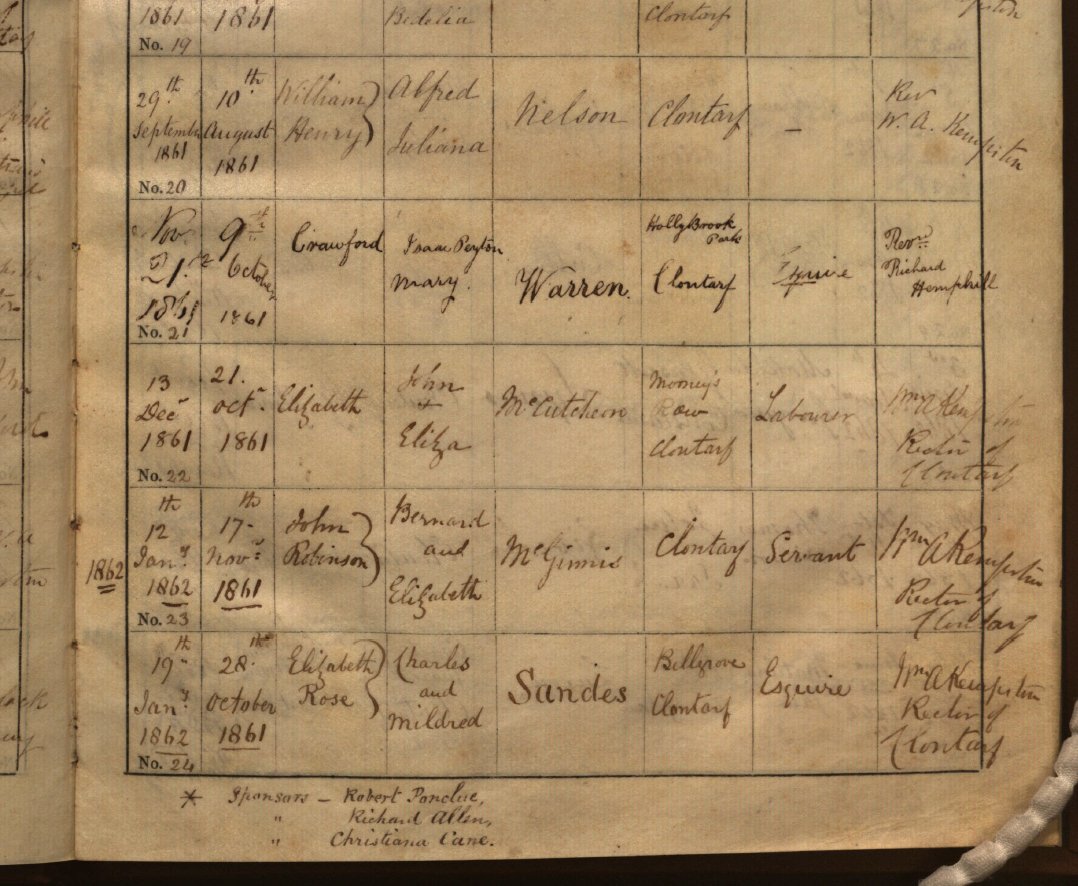 Area - DUBLIN (COI) , Parish/Church/Congregation - CLONTARF Baptism of ELIZABETH ROSE SANDES of BELLGROVE CLONTARF on 19 January 1862 Name ELIZABETH ROSE SANDES Date of Birth 28 October 1861 Address BELLGROVE CLONTARF Father CHARLES SANDES Mother MILDRED SANDES Further details in the record Father Occupation ESQUIRE