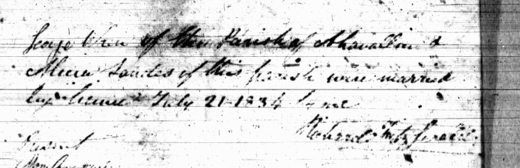 Marriage of GEORGE WREN of N/R and ALICIA SANDES of N/R on 21 July 1834