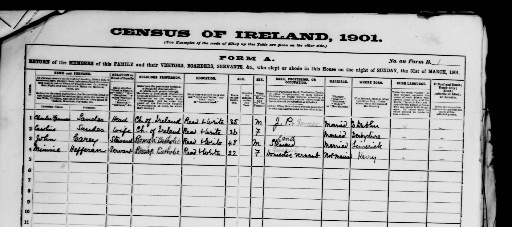 Sandes	Caroline	36	Female	Wife	Ch of Ireland