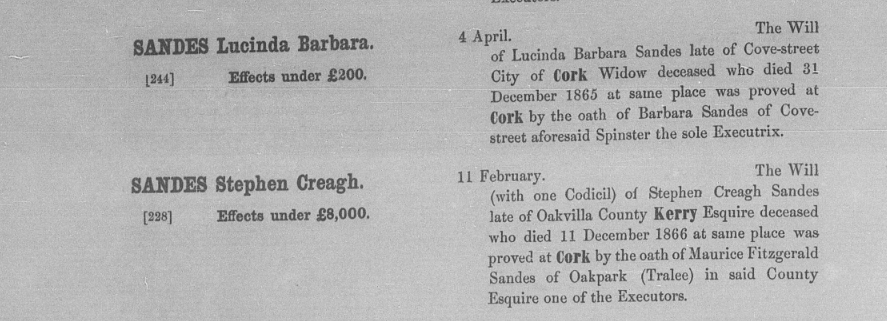 Deceased SurnameSandes Deceased ForenameStephen Creagh Primary Beneficiary/ExecutorMaurice Fitzgerald Sandes Date of Death11 Dec 1866 County of DeathKerry