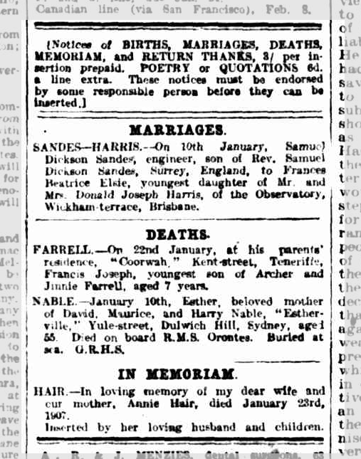 SANDES-HARRIS - On 10th January, Samuel Dickson Sandes, engineer, son of Rev. Samuel Dickson Sandes, Surrey, England, to Frances Beatrice Elsie, youngest daughter of Mr. and Mrs. Donald Joseph Harris, of the Observatory, Wickham terrace, Brisbane.