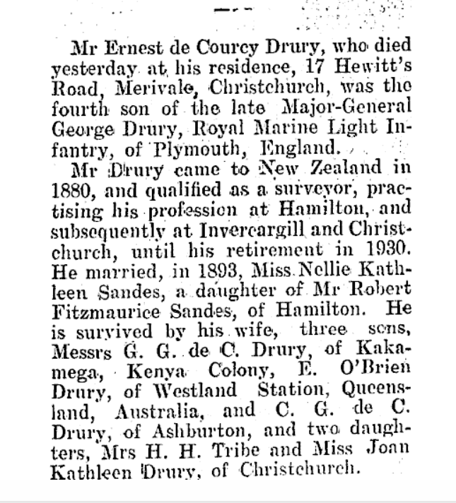 Mr Ernest de Courcy Drury, who died yesterday at his residence, 17 Hewitt's road, Merivale, Christchurch. was the fourth son of the late Major General George Drury Royal Marine Light Infantry, of Plymouth, England. Mr Drury came to New Zealand in 1880. and qualified as a surveyor practising his profession at Hamilton, and subsequently at Invercargill and Christchurch, until his retirement in 1930. He married, in 1893 Miss Nellie Kathleen Sandes, a daughter of Mr Robert Fitzmaurice Sandes, of Hamilton, and is survived by his widow, three sons, Messrs G. G. de C. Drury, of Kakamega, Kenya Colony, E. O'Brien Drury, of Westland Station, Queensland, Australia, and C. G. de C. Drury, of Ashburton, ana two daughters Mrs H. H. Tribe and Miss Joan Kathleen Drury, of Christchurch.